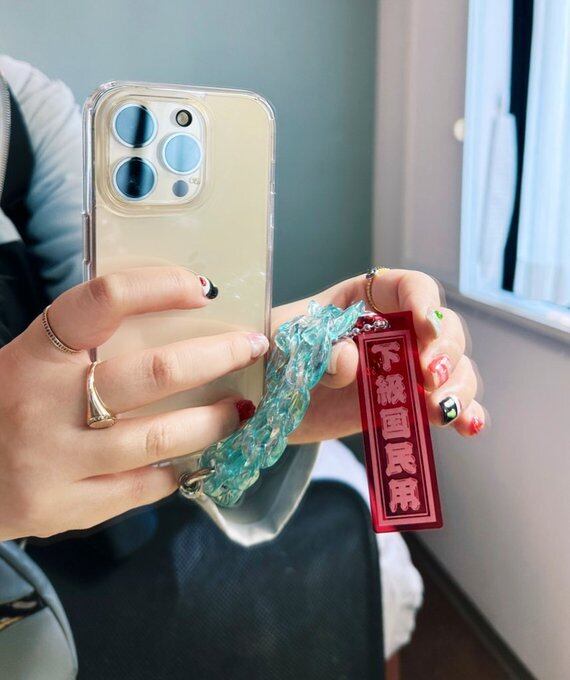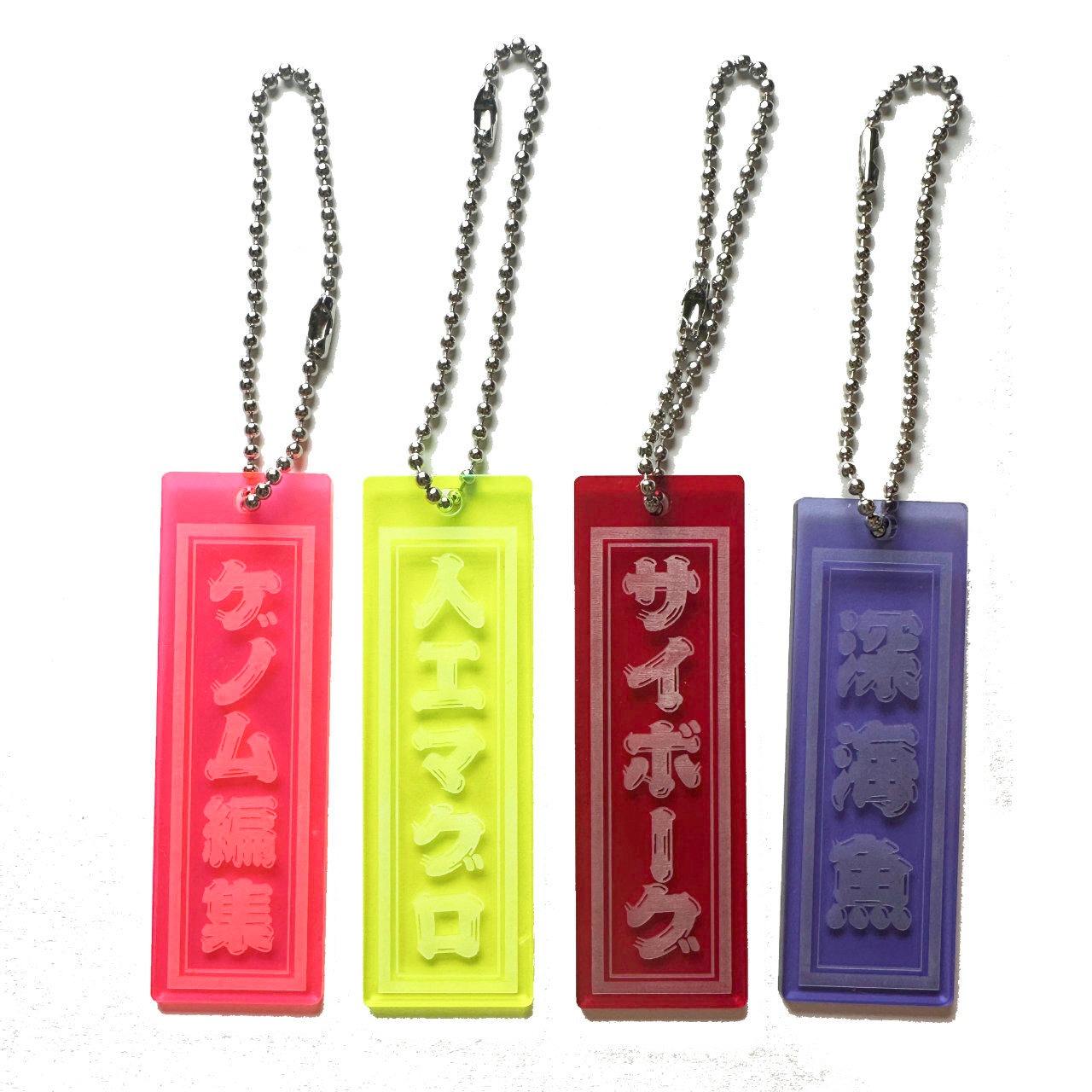 《未来SUSHI》にまつわるディストピアSF的な世界観のキーワードが、千社札モチーフのアクリルキーホルダーに彫刻されました。軽いけど存在感抜群。